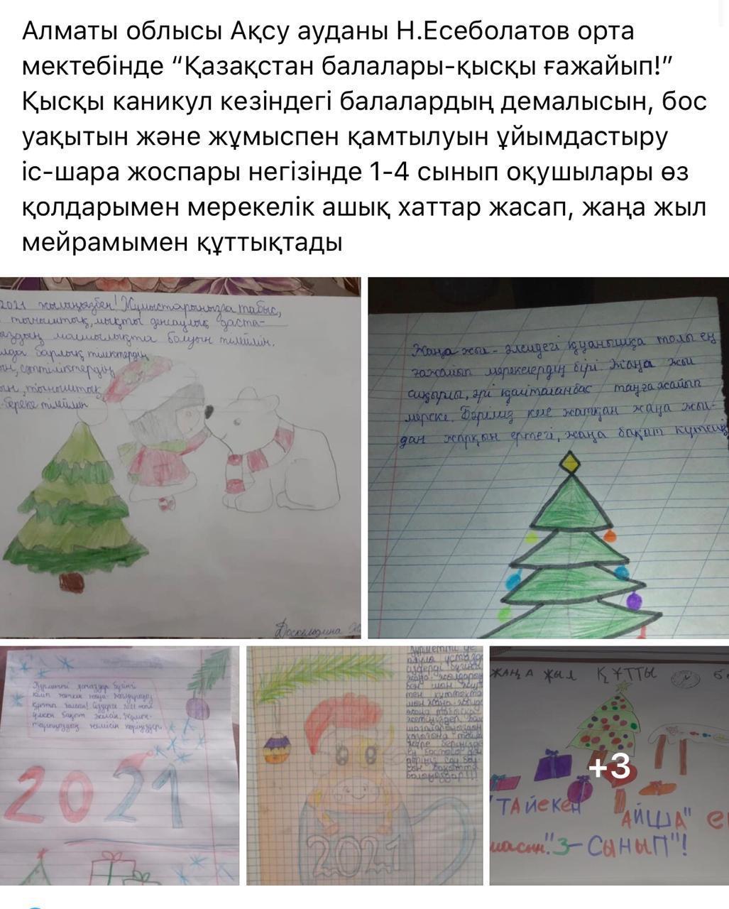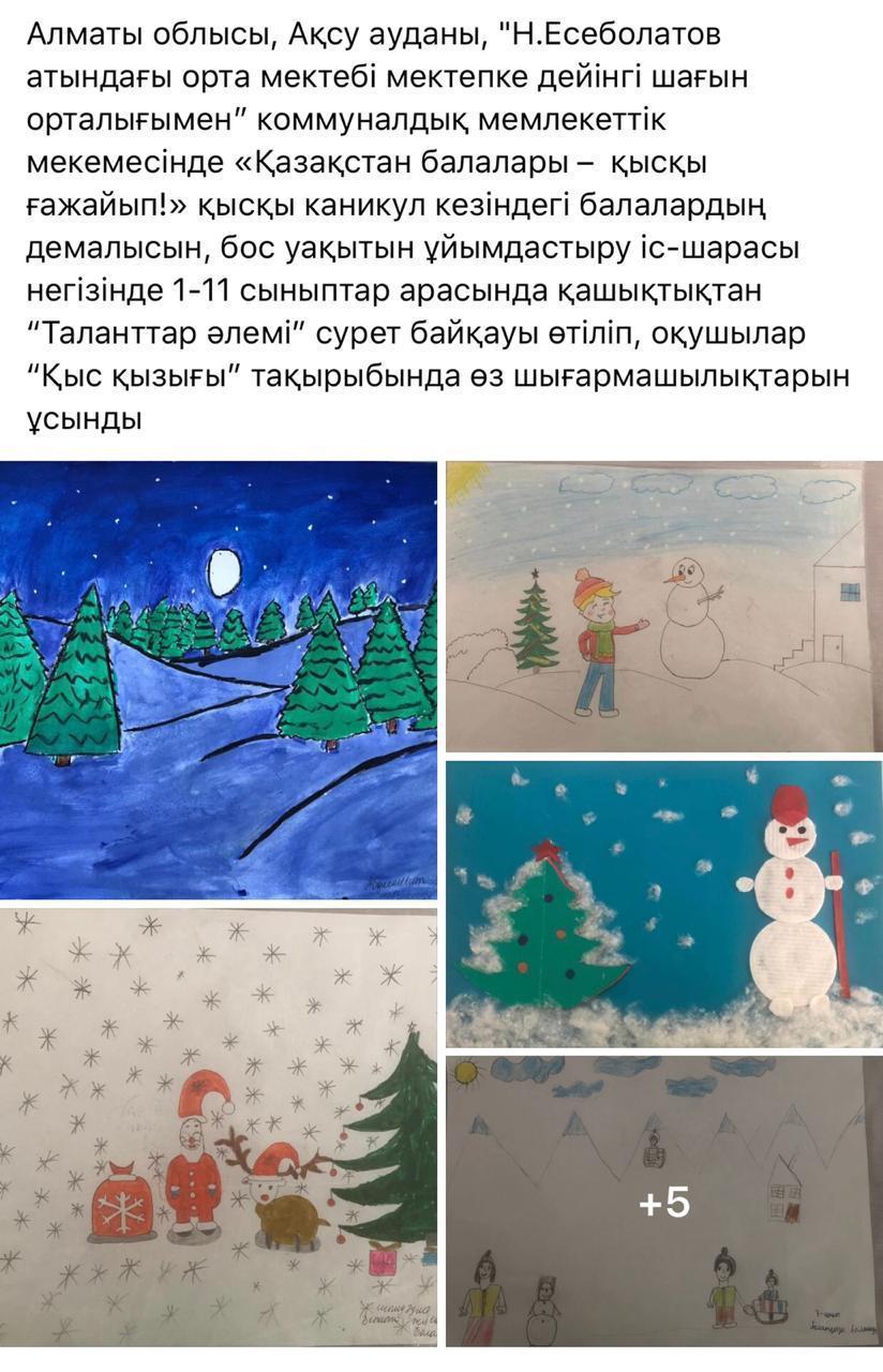 Алматинская область Ақсу ауданы Н.Есеболатов орта мектебінде “Қазақстан балалары-қысқы ғажайып!” Қысқы каникул кезіндегі балалардың демалысын, бос уақытын және жұмыспен қамтылуын ұйымдастыру іс-шарасы 30 желтоқсан мен 8 қаңтар аралығында өтілді